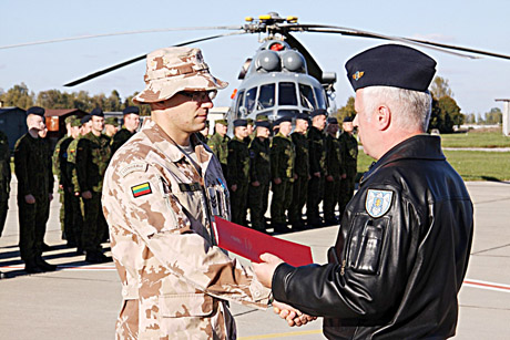 Afganistano nacionalinės kariuomenės sraigtasparnių pilotus ir jų aptarnavimo specialistus rengusiems kariams krašto apsaugos viceministras Antanas Valys ir šiuo metu KOP vado funkcijas atliekantis Aviacijos bazės vadas pulkininkas leitenantas Vidmantas Raklevičius įteikė medalius „Už tarptautines operacijas“.