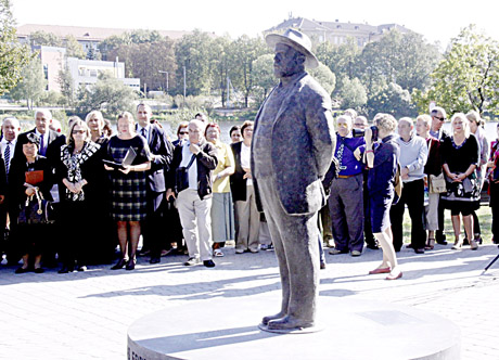 PAMINKLAS: Skverelyje priešais buvusį „Elnio“ fabriką vakar iškilmingai atidengta pramonininko, verslininko Ch. Frenkelio skulptūra. Skulptoriaus R. Kvinto sukurta bronzinė skulptūra kartu bus ir Ch. Frenkelio žmonos Doros atminimas.