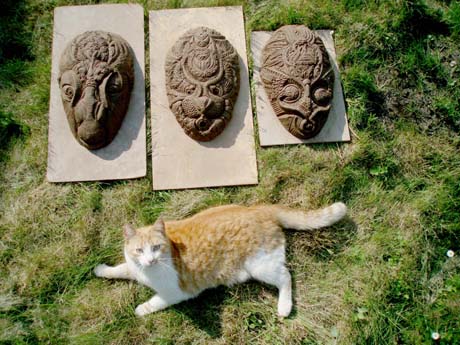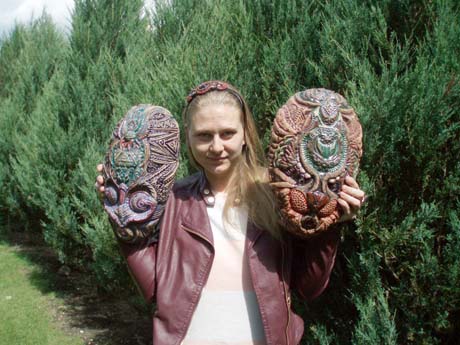 KAUKĖS: Keramikė Ieva Galkauskaitė su Baltijos šalių keramikos simpoziume sukurtomis kaukėmis iš molio.