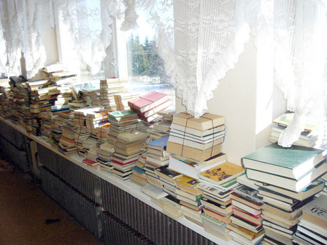 KNYGOS: Kol bus iš naujo surinktos lentynos, bibliotekos knygos guli ant palangių.