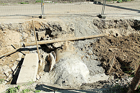 DARBAI: Per kasinėjimo darbus „Elnio“ fabriko teritorijoje įtrūkęs nukanalizuoto Kulpės upelio vamzdis sukėlė taršos pavojų – iš pradžių vamzdis užtaisytas moliu, o vėliau užbetonuotas.