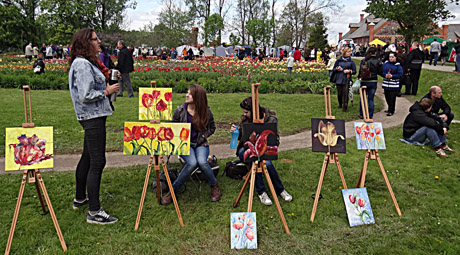 Parko šimtamečiai medžiai tarsi išsiskleidė įvairiaspalvių tulpių žiedais: prie medžių kamienų prigludo dailininkų paveikslai, kurių drobėse margavo šventės simboliai – pačių įvairiausių spalvų tulpės.