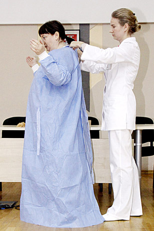 APSAUGA: Infekcijų kontrolės skyriaus specialistė Giedrė Rimkutė padeda slaugytojai apsivilkti vienkartinį chalatą – taip apsirengti reikia prieš einant pas Ebolos karštine sergantį pacientą.