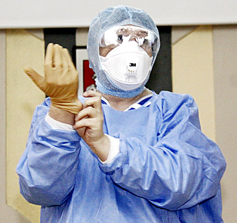 DRAUDIMAS: Darbo metu medicinos personalas negali rankomis liesti savo veido: akių, nosies, burnos, nes Ebolos virusas plinta per gleivines. Šios vienkartinės priemonės – kepuraitė, respiratorius ir akiniai – padeda užtikrinti saugumą. Po naudojimo jos turi būti atsargiai nuimamos nuo kūno ir tuoj pat išmetamos, o rankos – kruopščiai dezinfekuojamos.