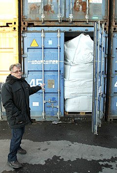 DIDMAIŠIAI: „Toksikos“ Šiaulių filialo direktorius Bronislovas Skarbalius rodo, kad deginant pavojingas atliekas susidarę lakieji pelenai supilami į didmaišius su dviguba izoliacija ir saugomi jūriniuose konteineriuose.