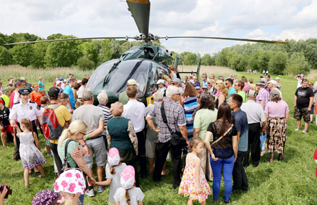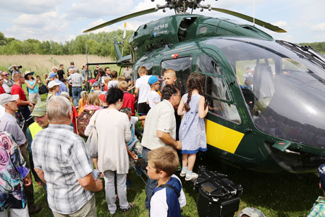 SKRYDIS: Kulminacija: danguje pasirodo pasieniečių sraigtasparnis „Eurocopter 145“. Minutė kita, ir jis nusileido tiesiai prieš šventės žiūrovus.