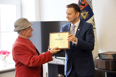 Susitikimo pradžioje meras Ch. Borowsky įteikė apdovanojimą-padėką už indėlį jungiant Lietuvos ir Amerikos kultūras.