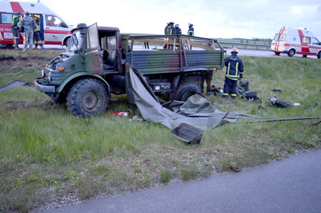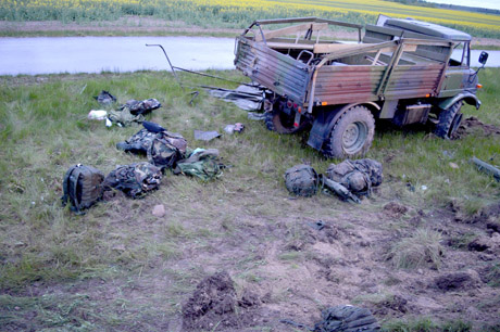 Kabinoje ir brezentu dengtoje priekaboje važiavę aštuoni kariai, verčiantis automobiliui, iškrito iš priekabos ir patyrė rimtus sužalojimus.