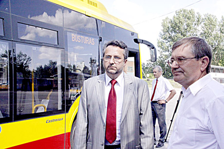 BIZNIS: Šiaulių miesto savivaldybės įmonės „Busturas“ generalinis direktorius Tomas Bielinskas (kairėje) giriasi pristatydamas naujus autobusus, bet nerado nė vieno, kuris nemokamai vežtų į Baltijos kelią. Meras Justinas Sartauskas rado išeitį – tegul verslininkai remia, o „Busturas“ pardavinės bilietus.