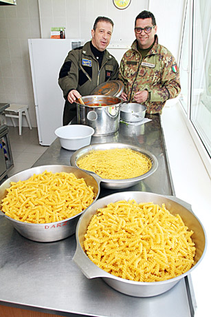 Šiau­lių kū­di­kių na­mų vir­tu­vė­je ka­riai ruo­šė ita­liš­kus pie­tus – spa­ge­čius ir spi­ra­lių for­mos ma­ka­ro­nus fu­sil­li, ku­riuos spe­cia­liai at­si­ve­žė iš Ita­li­jos. Vai­kams spa­ge­čiai bu­vo su­lau­žy­ti ne­di­de­liais ga­ba­liu­kais, kad pa­tie­ka­lą bū­tų leng­viau val­gy­ti.
