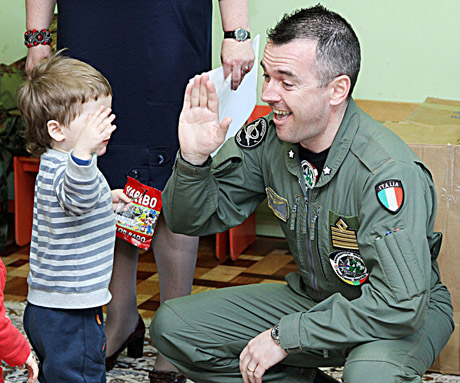 MI­SI­JA: Su vai­kais bend­ra­vęs Šiau­liuo­se oro po­li­ci­jos mi­si­ją at­lie­kan­čio Ita­li­jos kon­tin­gen­to va­das pul­ki­nin­kas Mar­co Ber­to­li sa­kė, jog svar­bi mi­si­jos da­lis – ne tik sau­go­ti Bal­ti­jos ša­lių oro erd­vę, bet ir pa­da­ry­ti kaž­ką svar­baus vai­kams.