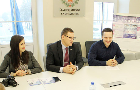 Šiaulių miesto savivaldybėje surengtoje spaudos konferencijoje Tarptautinį ledo skulptūrų festivalį Jelgavoje pristatė jo organizatoriai (iš kairės) atstovė spaudai Diana Mamedova, Jelgavos savivaldybės įstaigos „Kultūra“ vadovas Mintauts Buškevics, festivalio prodiuseris Gundars Caune.