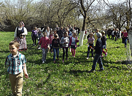 Pirmiausia visi ėjo žadinti sodo, jo medžius švelniai beldė, glostė, pasišnekėjo, savo stiprybe dalinosi. Kartu skambėjo folkloro ansamblio „Gerviki“ atliekamos dainos.