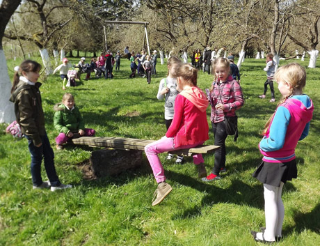 Vaikai pievoje klausėsi, ką žemelė kalba. Vertėsi kūliais.