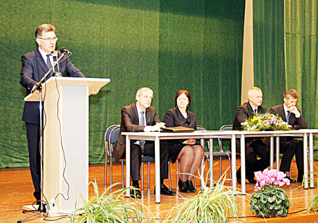KONFERENCIJA: Pirmą kartą Kelmėje surengtoje regioninėje konferencijoje žemės ūkio klausimais dalyvavęs Ministras Pirmininkas Algirdas Butkevičius (pirmas iš kairės) ragino stiprinti ūkius ir kooperuotis.