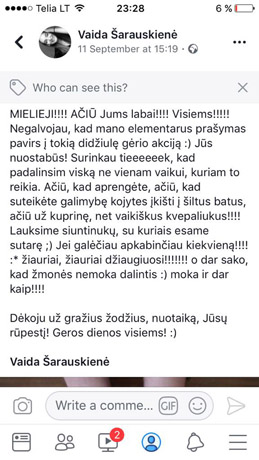 „Pa­gal­bos rei­kia mer­gai­tei, ku­ri šiais me­tais į rug­sė­jo pir­mo­sios šven­tę atė­jo su dviem dy­džiais per di­de­liais, nu­ply­šu­siais ba­tais. Krei­piuo­si į vi­sus, ku­rie tu­ri ne­rei­ka­lin­gų, ne­be­ne­šio­ja­mų, išė­ju­sių iš ma­dos, išaug­tų 36 dy­džio ba­tų. Pa­do­va­no­ki­me vai­kui ga­li­my­bę žie­mą pa­si­tik­ti šil­tai. Iš anks­to dė­ko­ju“, – ra­šė Vai­da.