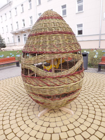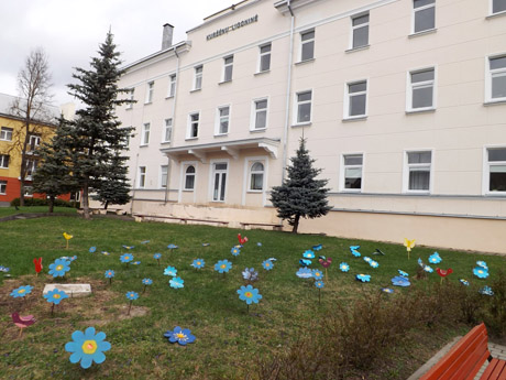 Iš vy­te­lių pin­to kiau­ši­nio vi­du­je pri­ka­bin­ta dirb­ti­nių paukš­te­lių. Kur­šė­nų švie­ti­mo įstai­gų pa­ga­min­to­mis gė­lė­mis pa­puoš­ta ir ap­lin­ka. Ta­ry­tum mels­vo­mis ži­bu­tė­mis pra­žy­du­sio­je pie­vo­je „su­tū­pė“ ir paukš­te­liai.