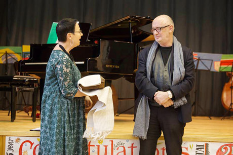 Šiau­lių „Laip­tų“ ga­le­ri­jos di­rek­to­rės Ja­ni­nos Ali­šaus­kie­nės do­va­na – pa­ro­dos au­to­riui Ado­mui Ja­covs­kiui.