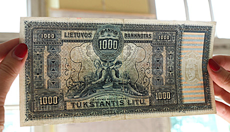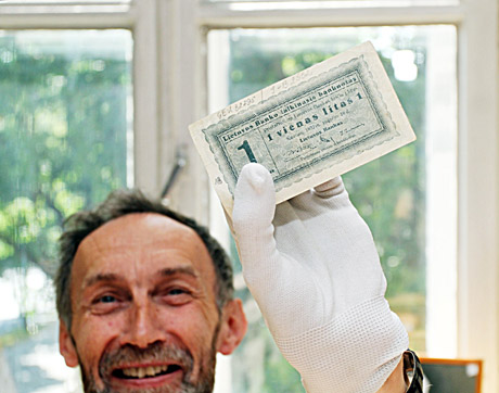 Vyr. muziejininkas, numizmatikos rinkinio kuratorius S. Bieliauskas demonstruoja vienus retesnių eksponatų – pirmos laidos 500 ir 1000 litų banknotus. Jų išspaudinta itin mažai, nes nebuvo poreikio – tarpukaryje mažai kas gaudavo tokio dydžio algą.