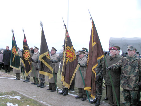 VĖLIAVOS: Prie 1949 metų Deklaracijos memorialo buvo atneštos partizanų apygardų vėliavos.