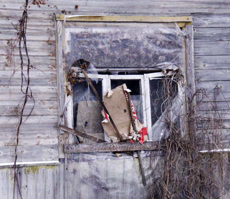 Namo langai užkalti fanera, užkaišioti senais skudurais. Tik viename lange dar likę palaikiai stiklai.