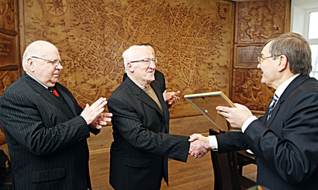 PADĖKA: Šiaulių miesto meras Justinas Sartauskas padėkas įteikė dviem jubiliatams (iš kairės): sporto entuziastui Vincui Baškiui ir Šiaulių sporto mokyklos „Atžalynas“ ilgamečiam darbuotojui Jurgiui Geringsonui.