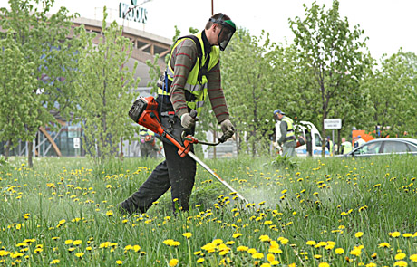 ŠIENAVIMAS: Šiemet miesto šienavimas prasidėjo anksčiau. Vakar buvo šienaujamos Dubijos gatvės prieigos.