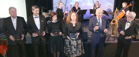 Apdovanoti įmonių, prieš 25-erius metus steigusių Šiaulių prekybos, pramonės ir amatų rūmus, vadovai (iš kairės) UAB „Šiaulių vandenų“ generalinis direktorius Jonas Matkevičius, AB „Neaustinių medžiagų fabriko“ generalinis direktorius Stanislovas Grušas, AB „Šiaulių banko“ kreditavimo projektų vadovė Elina Pranckevičienė , AB „Gubernijos“ generalinė direktorė Vijoleta Dunauskienė, rūmų steigėjas Kastytis Vyšniauskas bei vakaro vedėjas UAB „Metalo prekyba“ generalinis direktorius Jurgis Čepulis.