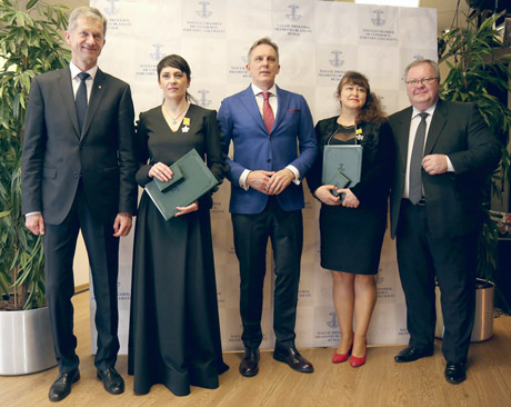 Šiaulių PPAR prezidentas Vidmantas Japertas, Panevėžio PPAR prezidentas Sigitas Gailiūnas ir generalinis direktorius Visvaldas Matkevičius sveikina III laipsnio „Darbo žvaigžde“ apdovanotas šiaulietes verslininkes Jūratę Kasperavičienę, UAB „Laurema“ direktorę, ir Gražiną Garuolienę, UAB „Verslavita“ direktorę.