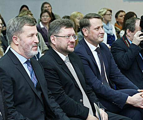 GRUPĖ: Su­si­ti­ki­me su Šiau­lių uni­ver­si­te­to bend­ruo­me­ne da­ly­va­vo ir Sei­mo na­riai Ed­var­das Ža­ka­ris (kai­rė­je) bei Va­le­ri­jus Si­mu­lik. De­ši­nė­je – Šiau­lių uni­ver­si­te­to stu­di­jų pro­rek­to­rius Re­mi­gi­jus Bub­nys.