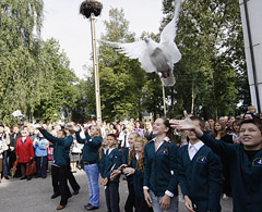 MOKYKLA: Rėkyvos pagrindinės mokykla džiaugiasi gandrų ir balandžių kaimynyste. Pastarųjų skrydis papuošė mokslo metų atidarymo šventę.