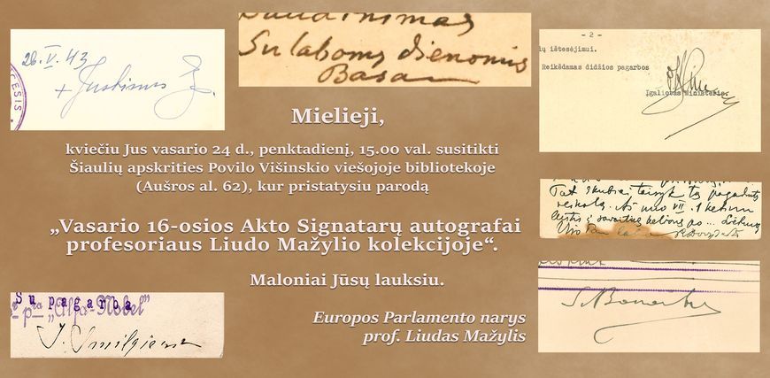 Vasario 16-osios Akto originalo atradėjas prof. L. Mažylis šalia savo pagrindinių darbų Europos Parlamente neapleidžia ir istorinės atminties temų. "Šiemet minime 105-ąjį Lietuvos gimtadienį. Džiaugiuosi, jog Vasario 16-ajai ir išskirtinėms Signatarų asmenybėms skirtą parodą pristatysiu Šiauliuose, kad turiu galimybę susitikti su tautiečiais ir kartu paminėti mums svarbią progą", – teigia prof. Liudas Mažylis. Akto atradimas Berlyne paskatino prof. Liudą Mažylį toliau gilintis į Signatarų asmenybes, jų veiklą įvairiais gyvenimo laikotarpiais. O pirmieji autografai asmeninėje prof. L. Mažylio kolekcijoje atsirado kur kas anksčiau, dar 2015 m., kai juos aptiko savo šeimos archyve.