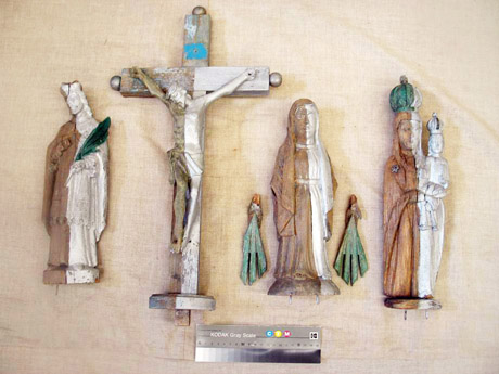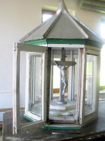 SKULPTŪROS: Koplytėlės vidaus skulptūrėlės šv. Jonas Nepomukas, švč. Mergelė Marija Maloningoji, Rūpintojėlis ir centre įmontuotas Krucifiksas (Nukryžiuotasis) restauravimo metu.