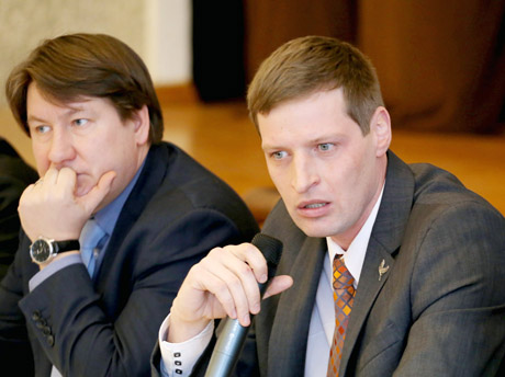 Seimo Aplinkos apsaugos komiteto pirmininkas Kęstutis Mažeika (dešinėje) sutiko, jog dvinarės rinkliavos nustatymo metodika nėra tobula, bet ragino ją įvesti. Šalia – pasitarimo iniciatorius Vitalijus Mitrofanovas, Akmenės rajono meras, Regiono plėtros tarybos pirmininkas.