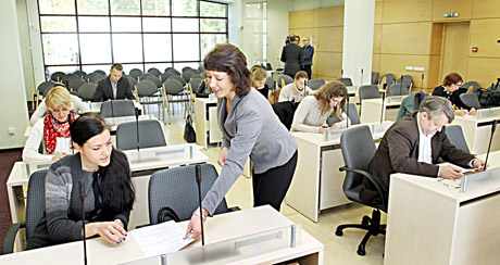 EGZAMINAS: Konstitucijos egzamino koordinatorė, Šiaulių miesto savivaldybės Teisės skyriaus vyr. specialistė Marina Adomavičė egzaminą laikantiems šiauliečiams išdalijo klausimų lapus.