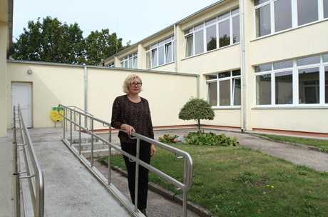 PANDUSAS: Lopšelio-darželio „Sigutė“ direktorė Renata Jonaitienė rodo kūdikėlių grupės prieigas. Pandusas įrengtas tam, kad mamos ir tėčiai į patalpas vaikutį galėtų įvežti vežimėliu.