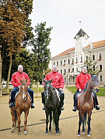 Šiandien pirmieji Šiaulių mieste patruliuoti pradėję raitieji policijos rėmėjai (iš kairės) Gintautas Sitnikas su Smaila, Gedeminas Vyšniauskas su Aviriu ir Edvardas Žakaris su Vaterlo tikisi, kad pradėta graži tradicija sulauks šiauliečių pritarimo ir padės palaikyti tvarką renginiuose ir žmonių poilsio vietose.