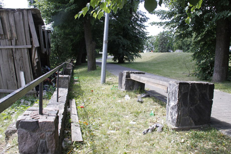 Medinis statinys, primenantis iš lentų sukaltą pašiūrę, stovi netoli centrinės turgavietės, šalia gyvenamųjų namų, prie turistų lankomo Sukilėlių kalnelio. Iš vidaus sklinda smarvė, benamiai ten pritempę murzinų skarmalų, šiukšlių, tuščių butelių, kurie mėtosi ir aplinkui. Sukilėlių kalnelio teritorijoje, greta pašiūrės stovintis suolelis taip pat apdergtas.