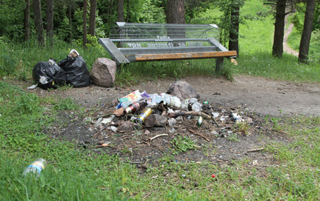 SITUACIJA: Salduvės parko prieigose šiukšlių dėžės pilnos, žolėje skęsta suoleliai.