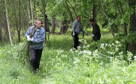 Parke vidudienį vaikštinėjo keletas moterų: viena vedžiojo šunį, kita skynėsi žolelių. Pačioje krūmų tankmėje pasigirsta balsai, pjūklais darbuojasi vyrai.