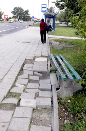 „Noriu pagalbos savo autobusų stotelei „Lieporiai“, – rašo redakcijai šiaulietė, kasdien važinėjanti iš šios stotelės. – Prie suoliuko, kur dažnai prisėda senyvi žmonės, tik toje vietoje, 3-4 m ilgio ir 1 m pločio išgriuvusios plytelės, įdubusi žemė. Šalia tiesiamas garsusis dviračių takas. Gal galima būtų tas blogas plyteles pakeisti, sutvakyti ir kelis kastuvus smėlio užpilti? Medžiagos ir klojėjai šalia.“
