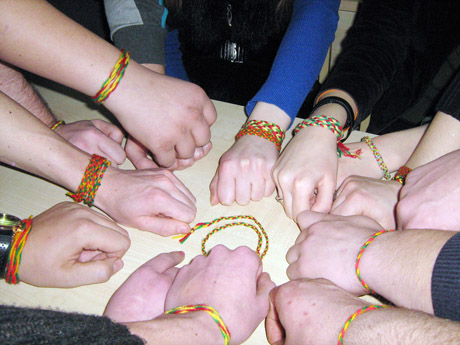 PYNĖJAI: Šiaulių profesinio rengimo centro Mechanikos skyriaus mokiniai pina trispalves draugystės apyrankes.