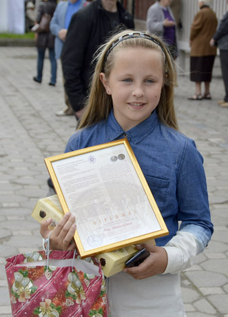 ĮVERTINIMAS: Knygų mugės metu Karalienės Mortos premija įteikta Vijolių vidurinės mokyklos trečiokei Ūlai Mitkevičiūtei už sukurtą etnografinę pasaką „Lietuvos milžinai“.