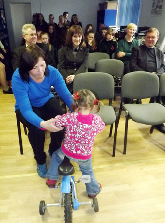DVIRATUKAS: Mergytė nekantravo išbandyti jai skirtą dovaną.