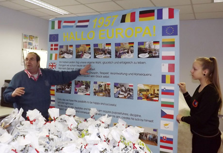 Švietimo centro salėje, kurioje vyko Zigfrido ir Ingrid Logalių susitikimas su kuršėniškiais, atidengtas plakatas vokiečių ir anglų kalbomis „Sveika, Europa“.