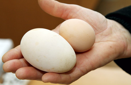Į „Šiaulių krašto“ redakciją užsukusi skaitytoja iš maišelio atsargiai ištraukė popierinį kiaušinių dėklą, kuriame buvo du kiaušiniai – galiūnas ir tradicinis.