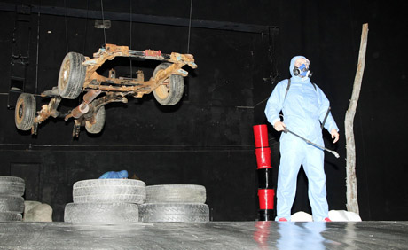 Scenoje specialiai nevaizduojamas namo interjeras, kabo surūdiję automobilio griaučiai, erdvė sukurta mobili, besitransformuojanti. Scenografiniai elementai taip pat atspindi ekologijos temą – vaizduojamas šiukšlių kalnas, simbolizuojantis šiukšlynu virstantį pasaulį.