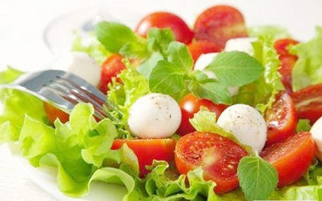 Lėkš­tę iš­klo­ti nu­plau­tais ir nu­sau­sin­tais sa­lo­tų la­pais. Ant jų dė­ti pu­siau per­pjau­tus po­mi­do­rus ir sū­rį. Sa­lo­tas api­bars­ty­ti drus­ka, smul­kin­tais pi­pi­rais, pa­šlaks­ty­ti alie­ju­mi ir pa­gar­din­ti ba­zi­li­ko la­pe­liais.