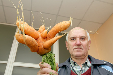 MORKA: Šiaulietis Antanas Juozapaitis, pasididžiavęs grandiozine keisto sudėjimo morka, sakė nešiąs ją į turgų ir įteiksiąs morkų prekeiviams: gal jo augintinė pravers kaip „reklaminis veidas“?