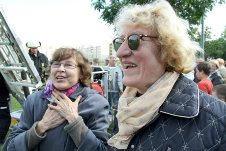 EMOCIJA: „Nė kiek nebaisu, labai patiko“, – neslėpė emocijų nusileidusios iš 42 metrų aukščio šiaulietės Janina Andrulienė (kairėje) ir Gražutė Motiejūnienė.